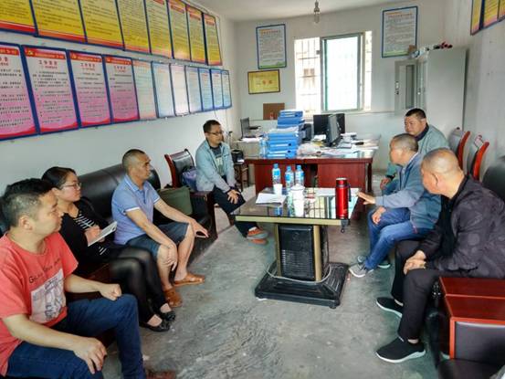 詹科长、丁主任与盘江镇镇长张华、白龙村村支书罗荣海、主任周少荣就采购白龙村农产品事宜进行沟通