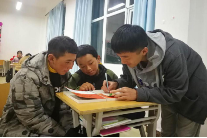 学生会干部王博宁辅导古松和西达娃同学学习