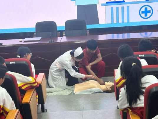 在教学过程中,团队还特别设置了多个模拟场景:如气道异物梗阻急救演练、心肺复苏实操训练、日常护理小伤口的实践等。学生们分组在专业指导下进行实操练习,团队成员一对一纠正动作要领,确保每位参与者都能掌握正确的操作方法。