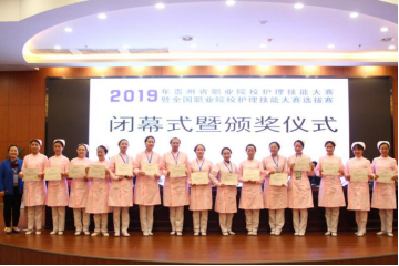 在欢快的气氛中,各位颁奖嘉宾为各组分获一、二、三等奖的选手颁奖并合影留念。最后,贵州省教育厅正处级调研员胡晓宣布“2019年贵州省职业院校护理技能大赛暨全国职业院校护理技能大赛选拔赛”圆满结束。