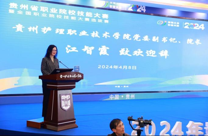江智霞为开幕式致欢迎辞,她代表学院党委、行政和全体教职工生向出席本次开幕式的各位领导、专家裁判、参赛选手,致以最热烈的欢迎和衷心的感谢。她首先简要介绍了学院的基本情况,接着表示,我院同时承办护理技能和药学技能两个赛项,为确保大赛顺利举办,学院党委、行政高度重视,多措并举、扎实推进大赛的各项筹办工作。这次大赛对标国赛标准,旨在为大家提供一个高标准、高水平的竞赛平台。技能人才队伍素质的整体提升是形成新质生产力的必要条件,而技能大赛则是选拔培养高素质复合型的技术技能人才的重要平台。希望我们各兄弟院校深度聚焦新质生产力对劳动力的新要求,充分利用好该平台,强化新质生产力技能队伍建设,为发展新质生产力提供强有力的人才支撑。最后,她表示,衷心祝愿所有参赛选手都能在比赛中享受快乐,磨砺自我,收获成长;祝愿各位领导、专家裁判身体健康、工作顺利、万事如意;预祝大赛取得圆满成功。