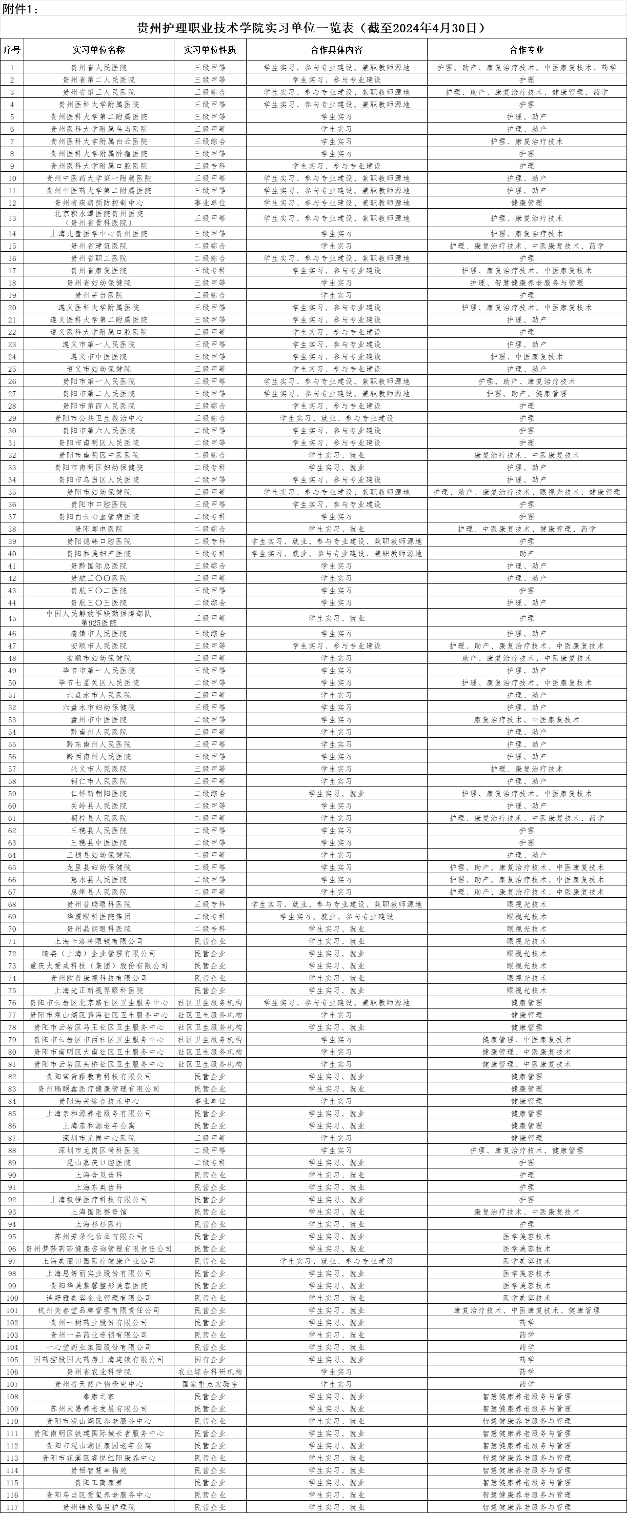 贵州护理职业技术学院校外实习基地一览表(截止至2024年4月30日)