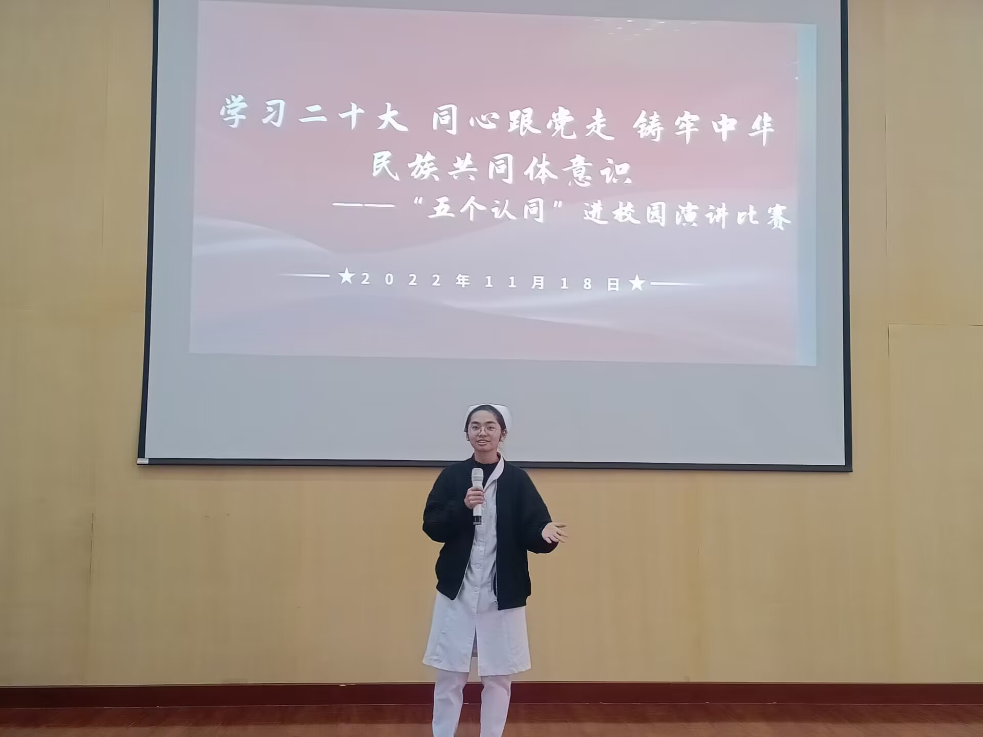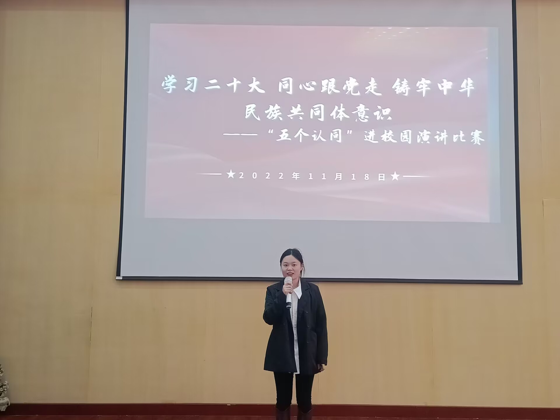 为深入学习党的二十大精神,进一步贯彻落实中央、省委、州委民族工作会议精神,扎实推进我州创建铸牢中华民族共同体意识模范州工作,引导我院学子铸牢中华民族共同体意识和增强对伟大祖国、中华民族、中华文化、中国共产党、中国特色社会主义的认同,牢固树立正确的祖国观、历史观、民族观,为学习贯彻党的二十大精神营造良好社会氛围,根据黔南统通【2022】33号文件,我院于11月18日下午在我院知行楼音乐厅开展了学习党的二十大 同心跟党走 铸牢中华民族共同体意识——“五个认同”进校园演讲比赛。