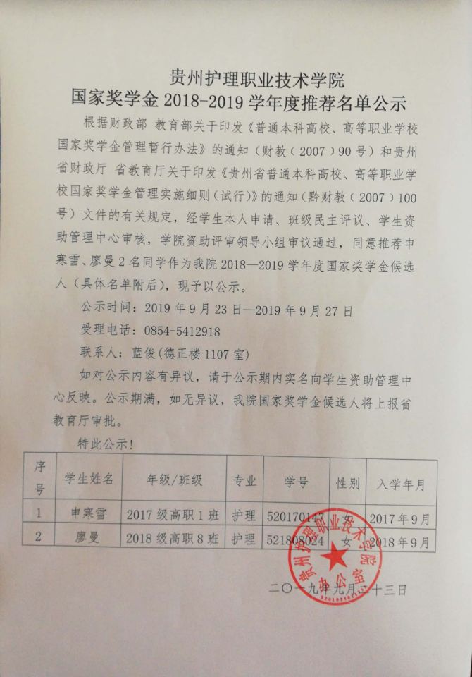 国家奖学金2018-2019学年推荐名单公示