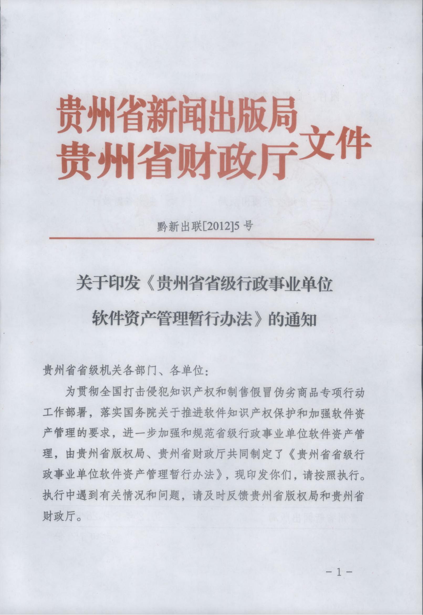 关于印发《贵州省省级行政事业单位软件资产管理暂行办法》的通知
